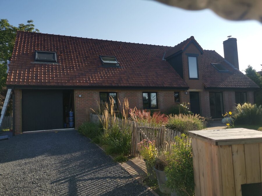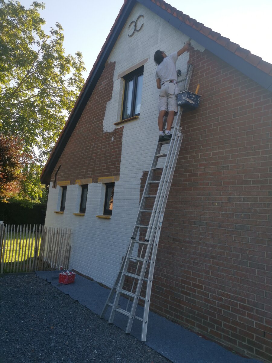 Cette maison, bâtie en briques anciennes, avait un aspect très terne qui ne mettait pas en valeur son potentiel. Avec des pignons atteignant 7 mètres de haut et environ 150 m² de surface à repeindre, ce chantier représentait un défi technique que j’étais prêt à relever.