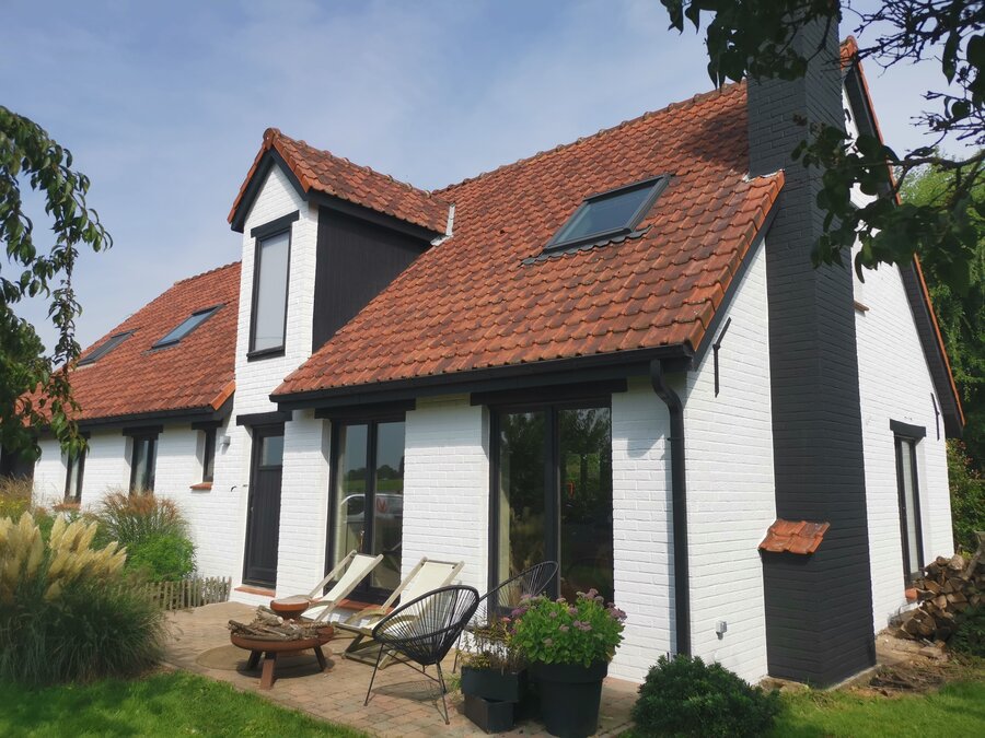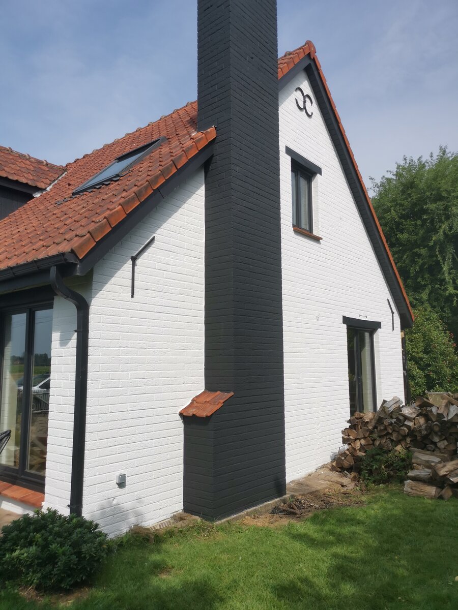 Pour redonner à cette maison une apparence moderne et lumineuse, j’ai proposé de repeindre les façades dans un blanc éclatant. Afin d’apporter du caractère et de structurer visuellement l’ensemble, la cheminée a été mise en valeur avec un noir profond et élégant. Ce choix audacieux, qui personnalise fortement l’apparence de la maison, a immédiatement séduit le propriétaire.