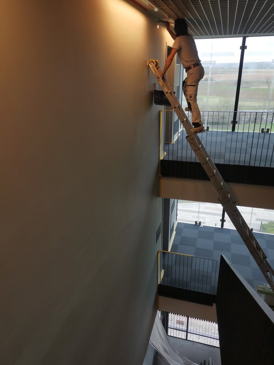 Ce projet concernait des bureaux dont les murs étaient jusqu’alors peints en orange vif, une teinte agressive qui épuisait les employés et renvoyait une image peu favorable auprès des clients. Ce chantier présentait un défi particulier : la hauteur des murs de la cage d’escalier rendait impossible l’utilisation d’un échafaudage, ce qui avait découragé plusieurs entreprises avant nous.